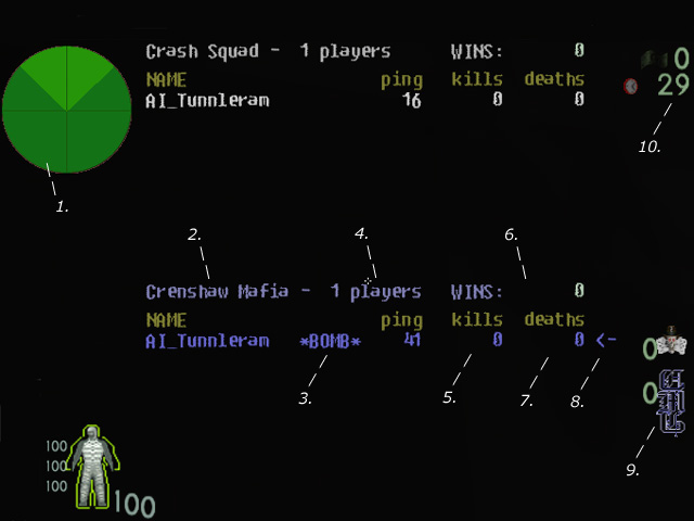 When you first join a CRASH Squad server it will look similar to playing Bagman or Team Deathmatch. You can join the game a few ways. To join the CRASH Squad simply press the number 1 or in the console type TEAM CRA. To join the Crenshaw Mafia simply press the number 2 or in the console type TEAM CRE. Typing TEAM CRA or TEAM CRE is most likely the easiest way to switch teams while in a game. Typing SPEC or SPECTATOR will put you in spectator mode